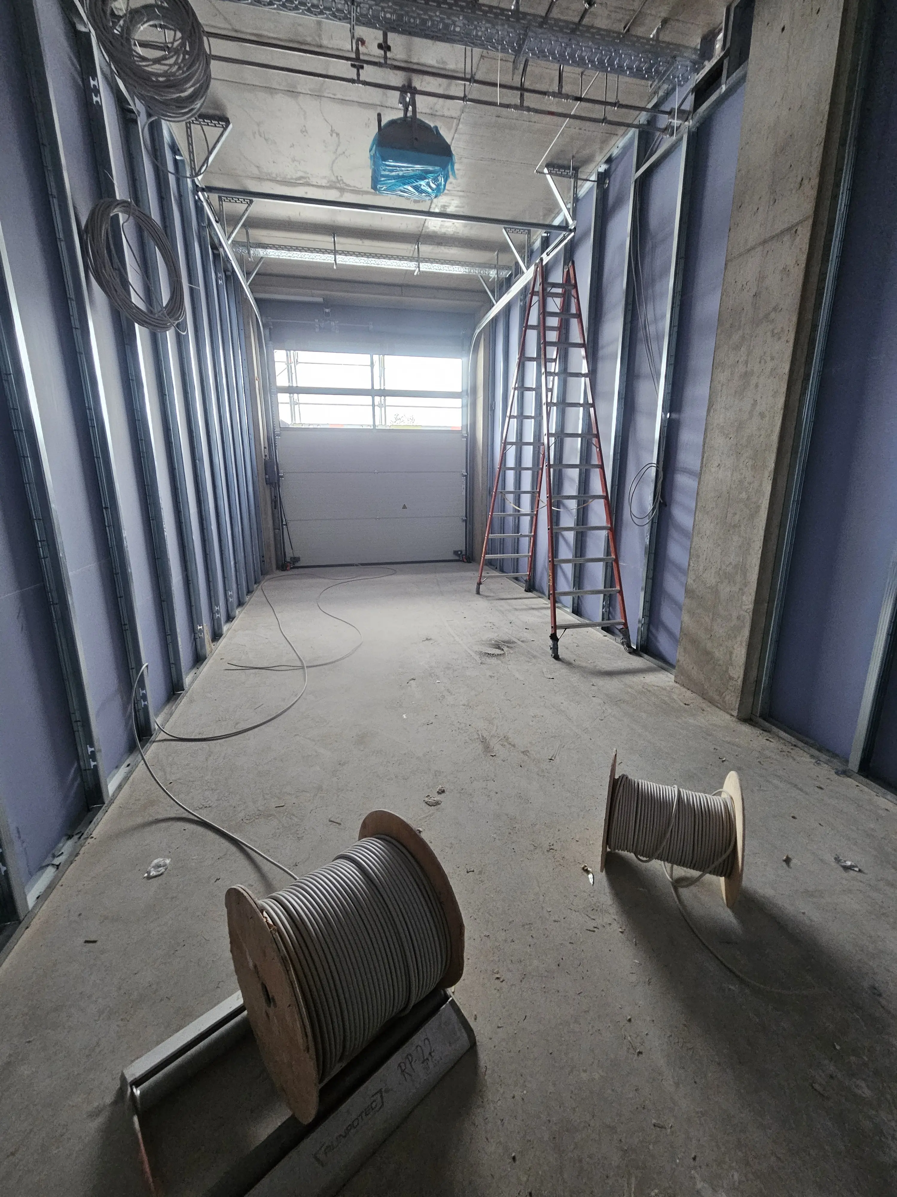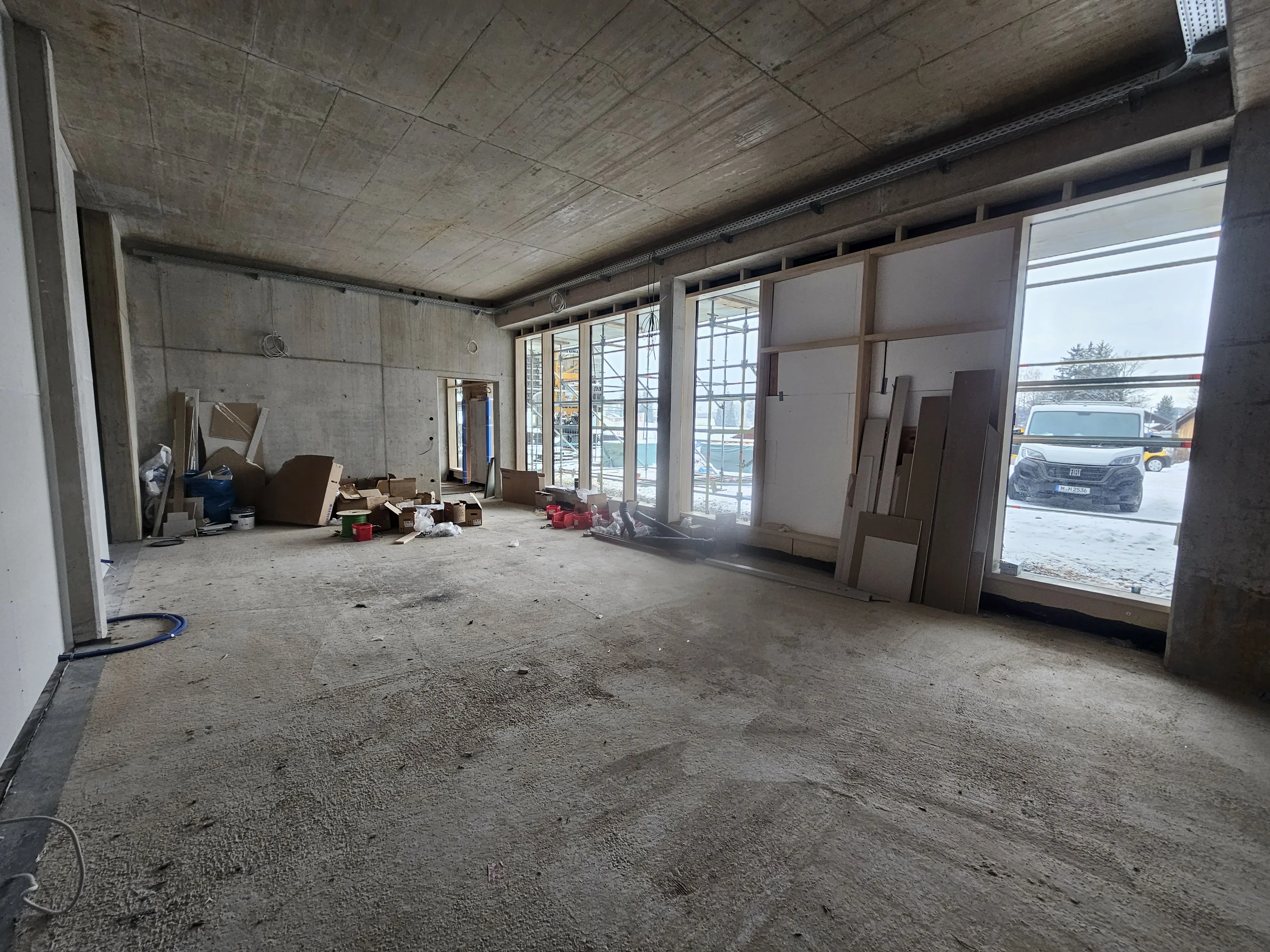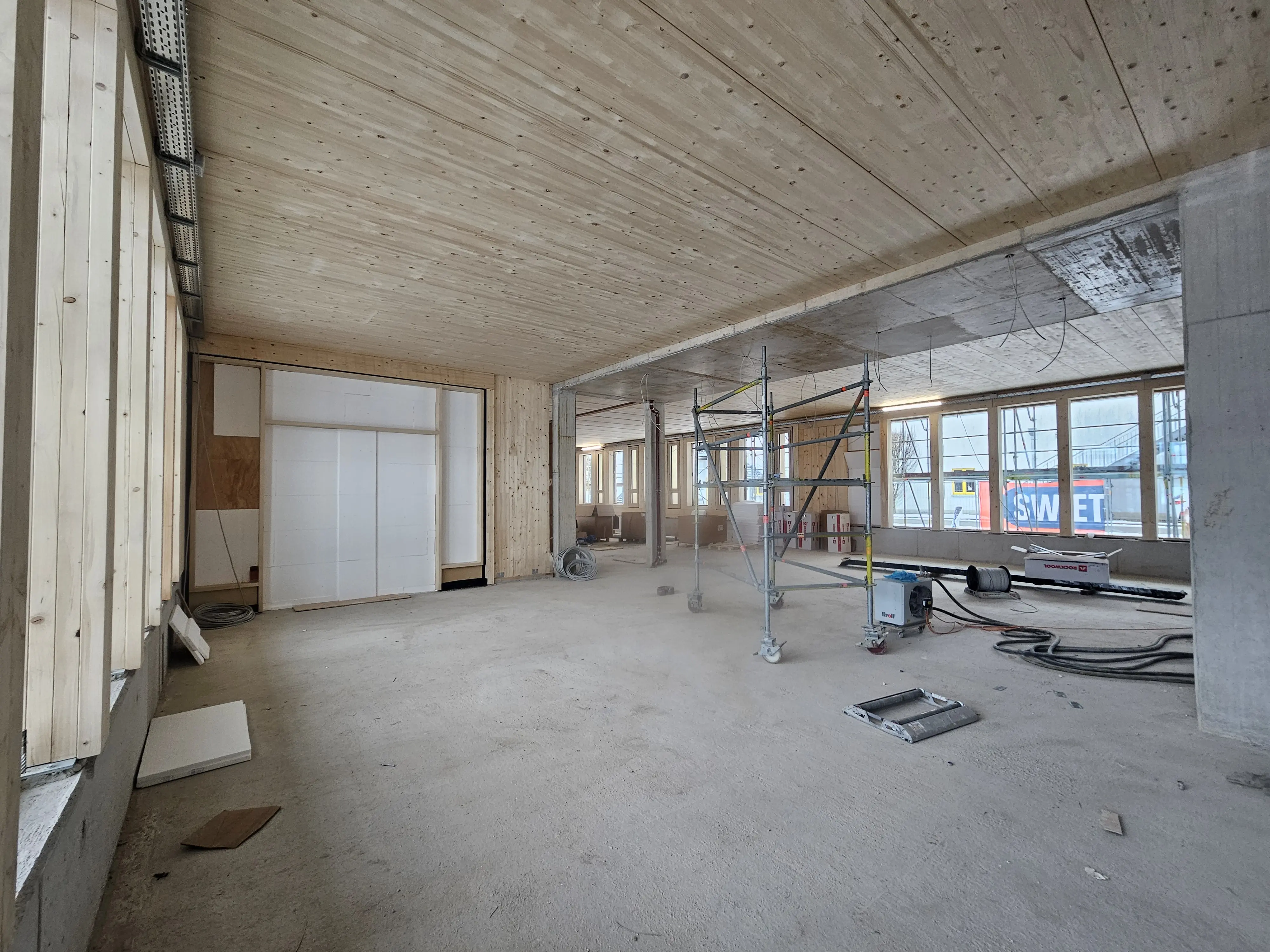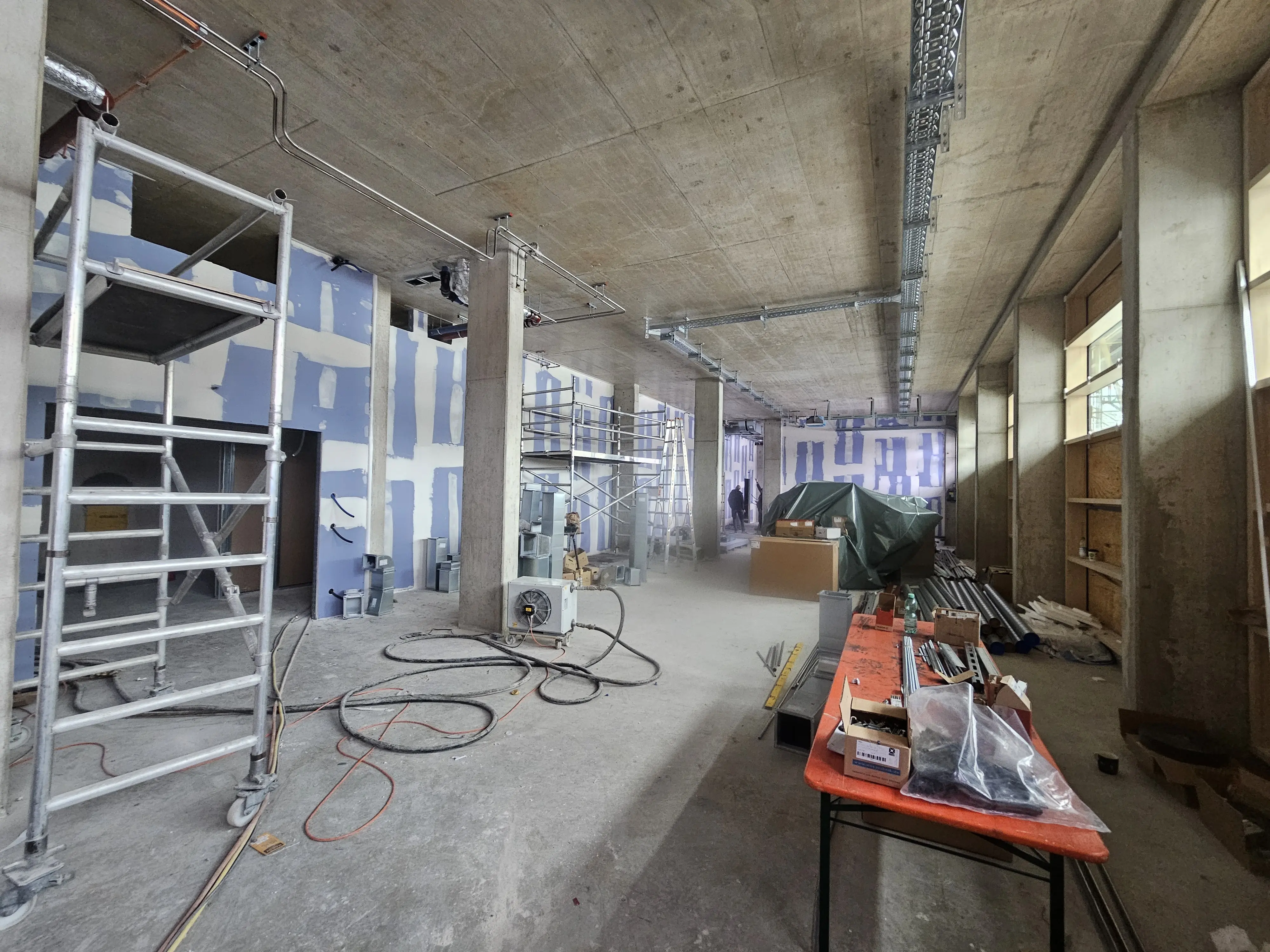 Ein erster Blick ins Innere zeigt das großzügige Foyer mit viel Raum für Besucher auf der zweiten Ebene. Aut dieser Ebene und der Ebene drei entstehen offene Bürokonzepte. Der Blick in den Lageraum auf Ebene drei lässt die künftige Nutzung bereits erahnen. Auf dieser Ebene werden zudem kleine Übernachtungseinheiten realisiert.