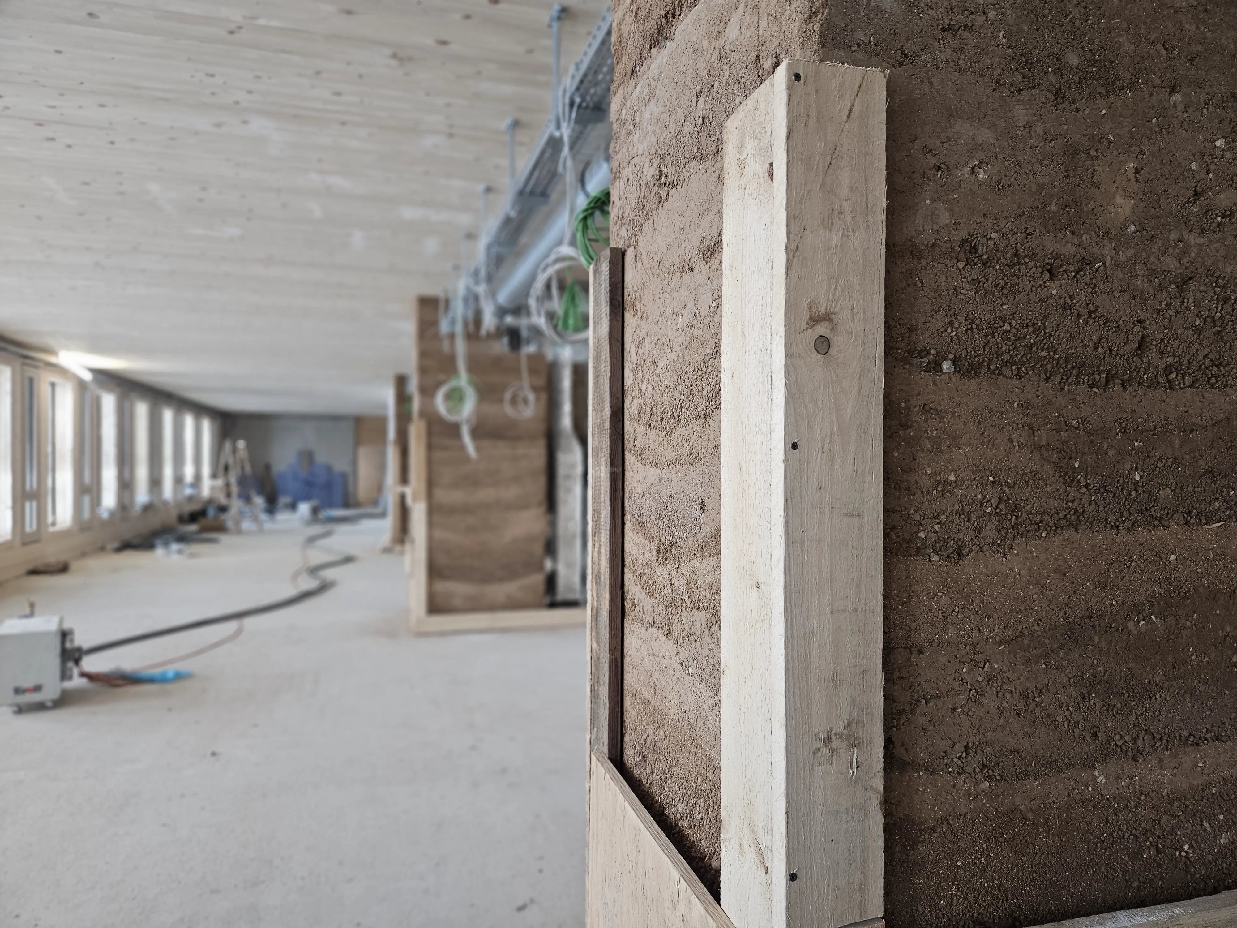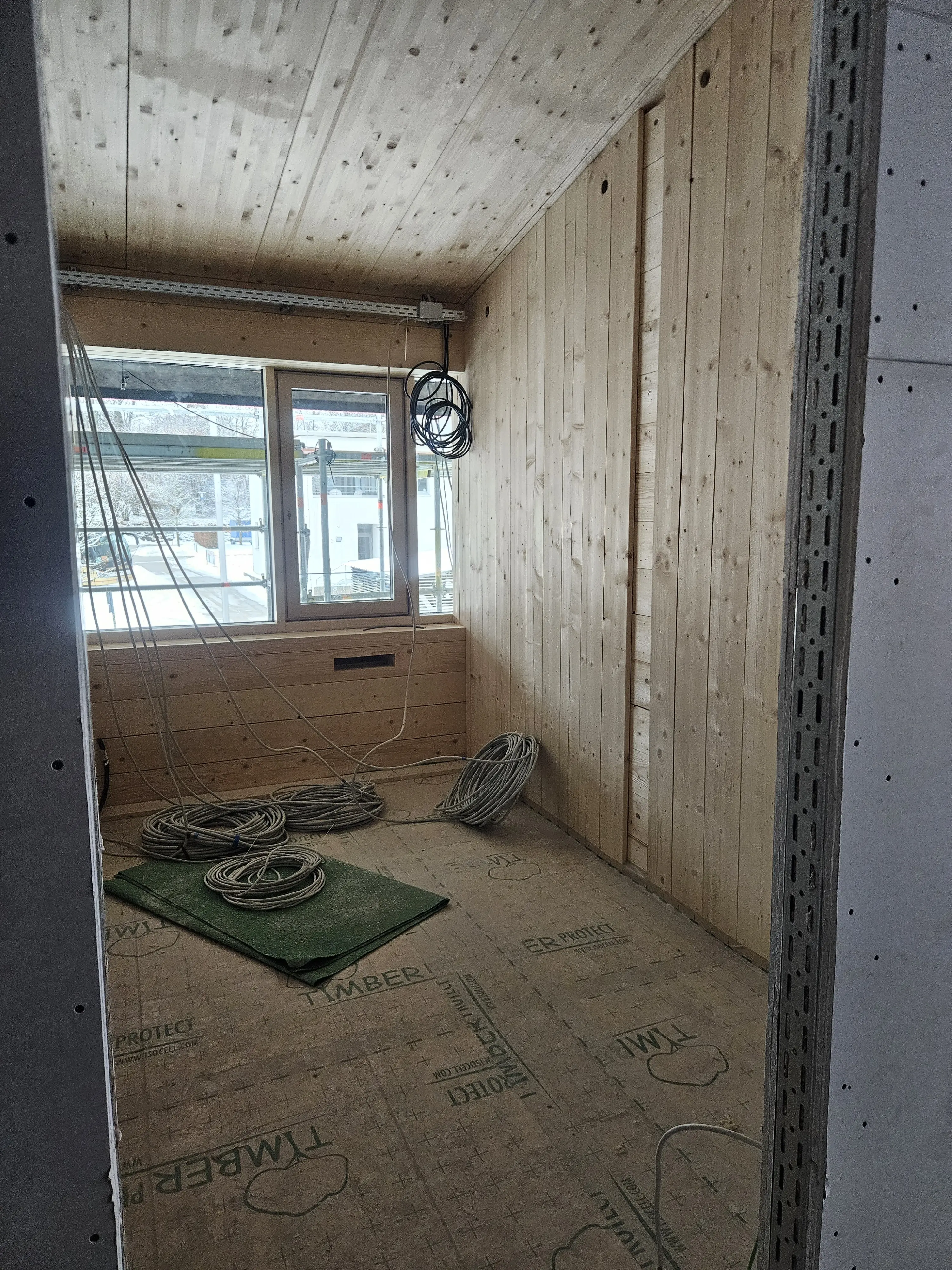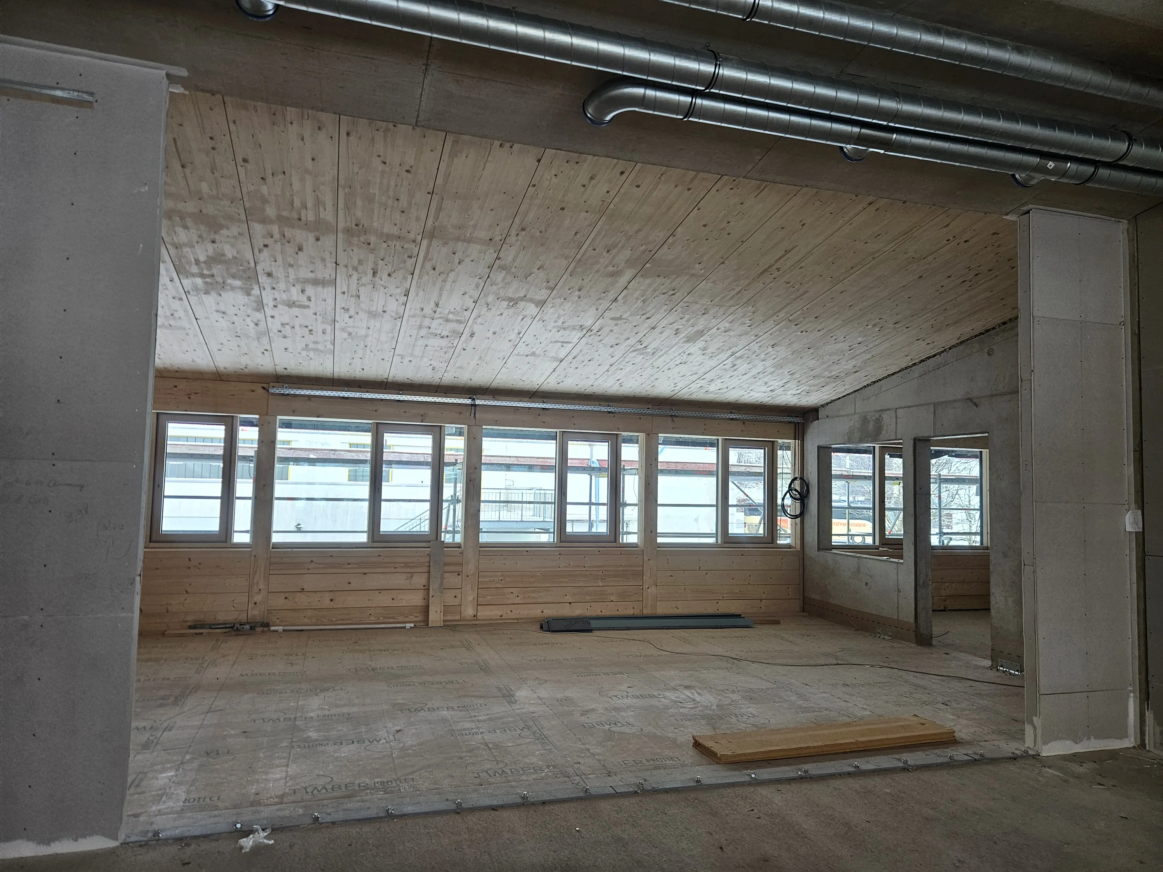 Der Baufortschritt am Bayerischen Zentrum für Alpine Sicherheit ist deutlich sichtbar. An der Ostseite wächst bereits die Holzaußenfassade.